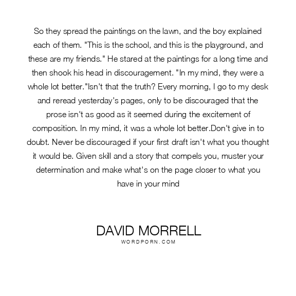 So they spread the paintings on the lawn, and the boy explained each of them. "This is the school, and this is the playground, and these are my friends." He stared at the paintings for a long time and then shook his head in discouragement. "In my mind, they were a whole lot better."Isn't that the truth? Every morning, I go to my desk and reread yesterday's pages, only to be discouraged that the prose isn't as good as it seemed during the excitement of composition. In my mind, it was a whole lot better.Don't give in to doubt. Never be discouraged if your first draft isn't what you thought it would be. Given skill and a story that compels you, muster your determination and make what's on the page closer to what you have in your mind