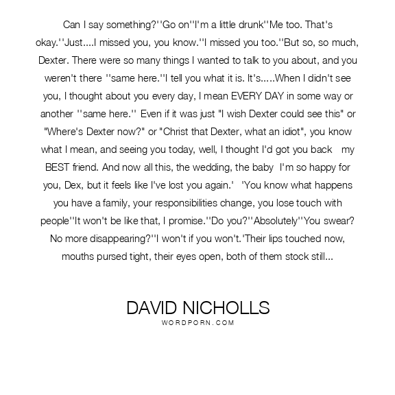Can I say something?''Go on''I'm a little drunk''Me too. That's okay.''Just....I missed you, you know.''I missed you too.''But so, so much, Dexter. There were so many things I wanted to talk to you about, and you weren't there-''same here.''I tell you what it is. It's.....When I didn't see you, I thought about you every day, I mean EVERY DAY in some way or another-''same here.''-Even if it was just "I wish Dexter could see this" or "Where's Dexter now?" or "Christ that Dexter, what an idiot", you know what I mean, and seeing you today, well, I thought I'd got you back - my BEST friend. And now all this, the wedding, the baby- I'm so happy for you, Dex, but it feels like I've lost you again.'--'You know what happens you have a family, your responsibilities change, you lose touch with people''It won't be like that, I promise.''Do you?''Absolutely''You swear? No more disappearing?''I won't if you won't.'Their lips touched now, mouths pursed tight, their eyes open, both of them stock still. The moment held, a kind of glorious confusion