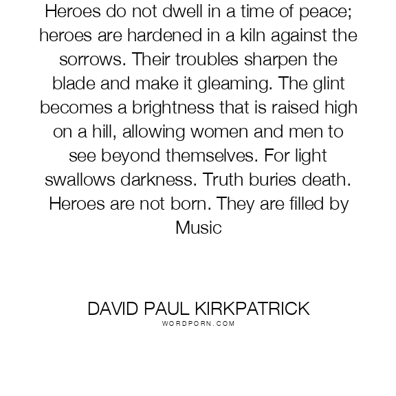 Heroes do not dwell in a time of peace; heroes are hardened in a kiln against the sorrows. Their troubles sharpen the blade and make it gleaming. The glint becomes a brightness that is raised high on a hill, allowing women and men to see beyond themselves. For light swallows darkness. Truth buries death. Heroes are not born. They are filled by Music