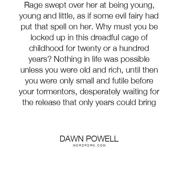Rage swept over her at being young, young and little, as if some evil fairy had put that spell on her. Why must you be locked up in this dreadful cage of childhood for twenty or a hundred years? Nothing in life was possible unless you were old and rich, until then you were only small and futile before your tormentors, desperately waiting for the release that only years could bring