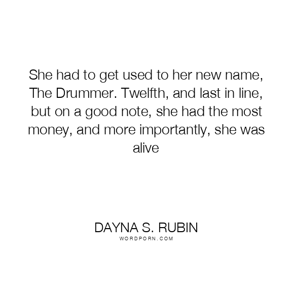 She had to get used to her new name, The Drummer. Twelfth, and last in line, but on a good note, she had the most money, and more importantly, she was alive