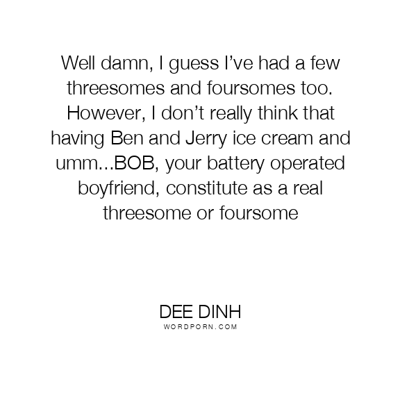 Well damn, I guess I’ve had a few threesomes and foursomes too. However, I don’t really think that having Ben and Jerry ice cream and umm...BOB, your battery operated boyfriend, constitute as a real threesome or foursome
