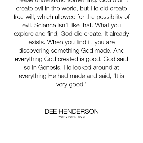 Please understand something. God didn’t create evil in the world, but He did create free will, which allowed for the possibility of evil. Science isn’t like that. What you explore and find, God did create. It already exists. When you find it, you are discovering something God made. And everything God created is good. God said so in Genesis. He looked around at everything He had made and said, ‘It is very good.’
