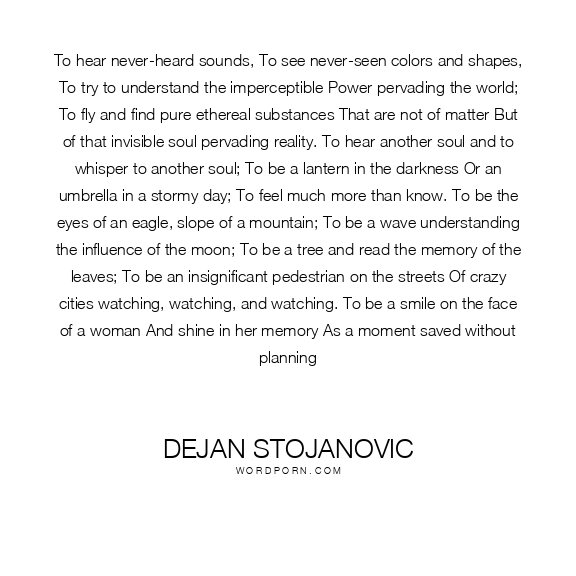 To hear never-heard sounds, To see never-seen colors and shapes, To try to understand the imperceptible Power pervading the world; To fly and find pure ethereal substances That are not of matter But of that invisible soul pervading reality. To hear another soul and to whisper to another soul; To be a lantern in the darkness Or an umbrella in a stormy day; To feel much more than know. To be the eyes of an eagle, slope of a mountain; To be a wave understanding the influence of the moon; To be a tree and read the memory of the leaves; To be an insignificant pedestrian on the streets Of crazy cities watching, watching, and watching. To be a smile on the face of a woman And shine in her memory As a moment saved without planning