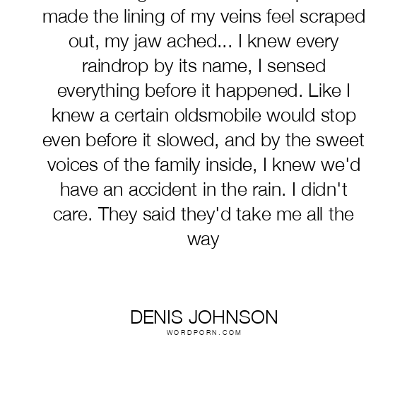 The traveling salesmen fed me pills that made the lining of my veins feel scraped out, my jaw ached... I knew every raindrop by its name, I sensed everything before it happened. Like I knew a certain oldsmobile would stop even before it slowed, and by the sweet voices of the family inside, I knew we'd have an accident in the rain. I didn't care. They said they'd take me all the way