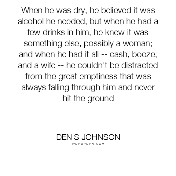 When he was dry, he believed it was alcohol he needed, but when he had a few drinks in him, he knew it was something else, possibly a woman; and when he had it all -- cash, booze, and a wife -- he couldn't be distracted from the great emptiness that was always falling through him and never hit the ground