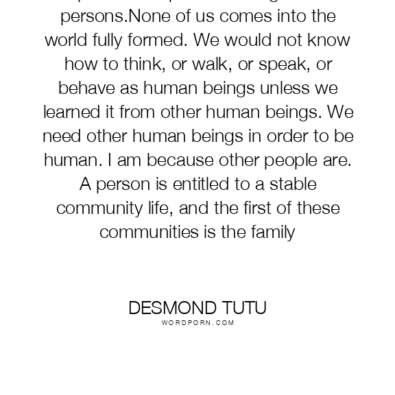 A person is a person through other persons.None of us comes into the world fully formed. We would not know how to think, or walk, or speak, or behave as human beings unless we learned it from other human beings. We need other human beings in order to be human. I am because other people are. A person is entitled to a stable community life, and the first of these communities is the family