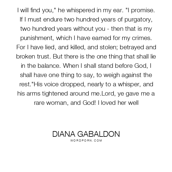 I will find you," he whispered in my ear. "I promise. If I must endure two hundred years of purgatory, two hundred years without you - then that is my punishment, which I have earned for my crimes. For I have lied, and killed, and stolen; betrayed and broken trust. But there is the one thing that shall lie in the balance. When I shall stand before God, I shall have one thing to say, to weigh against the rest."His voice dropped, nearly to a whisper, and his arms tightened around me.Lord, ye gave me a rare woman, and God! I loved her well