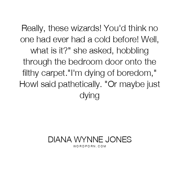 Really, these wizards! You'd think no one had ever had a cold before! Well, what is it?" she asked, hobbling through the bedroom door onto the filthy carpet."I'm dying of boredom," Howl said pathetically. "Or maybe just dying