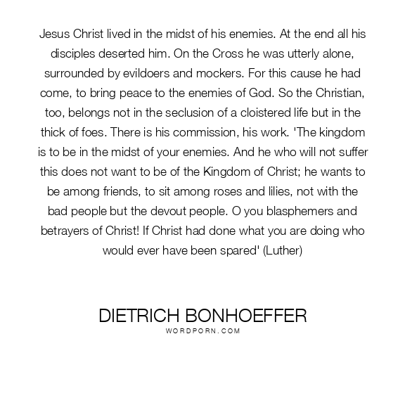 Jesus Christ lived in the midst of his enemies. At the end all his disciples deserted him. On the Cross he was utterly alone, surrounded by evildoers and mockers. For this cause he had come, to bring peace to the enemies of God. So the Christian, too, belongs not in the seclusion of a cloistered life but in the thick of foes. There is his commission, his work. 'The kingdom is to be in the midst of your enemies. And he who will not suffer this does not want to be of the Kingdom of Christ; he wants to be among friends, to sit among roses and lilies, not with the bad people but the devout people. O you blasphemers and betrayers of Christ! If Christ had done what you are doing who would ever have been spared' (Luther)