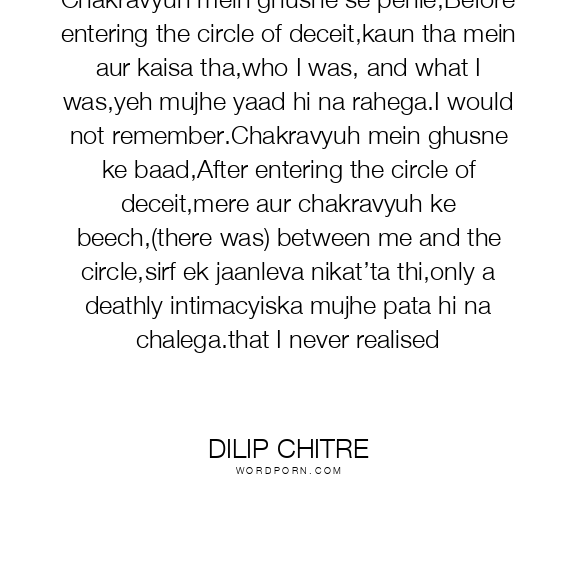 Chakravyuh mein ghusne se pehle,Before entering the circle of deceit,kaun tha mein aur kaisa tha,who I was, and what I was,yeh mujhe yaad hi na rahega.I would not remember.Chakravyuh mein ghusne ke baad,After entering the circle of deceit,mere aur chakravyuh ke beech,(there was) between me and the circle,sirf ek jaanleva nikat’ta thi,only a deathly intimacyiska mujhe pata hi na chalega.that I never realised
