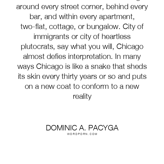 There seems to be a different Chicago around every street corner, behind every bar, and within every apartment, two-flat, cottage, or bungalow. City of immigrants or city of heartless plutocrats, say what you will, Chicago almost defies interpretation. In many ways Chicago is like a snake that sheds its skin every thirty years or so and puts on a new coat to conform to a new reality
