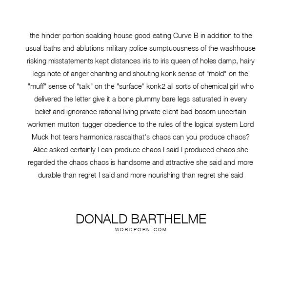 the hinder portion scalding-house good eating Curve B in addition to the usual baths and ablutions military police sumptuousness of the washhouse risking misstatements kept distances iris to iris queen of holes damp, hairy legs note of anger chanting and shouting konk sense of "mold" on the "muff" sense of "talk" on the "surface" konk2 all sorts of chemical girl who delivered the letter give it a bone plummy bare legs saturated in every belief and ignorance rational living private client bad bosom uncertain workmen mutton-tugger obedience to the rules of the logical system Lord Muck hot tears harmonica rascalthat's chaos can you produce chaos? Alice asked certainly I can produce chaos I said I produced chaos she regarded the chaos chaos is handsome and attractive she said and more durable than regret I said and more nourishing than regret she said
