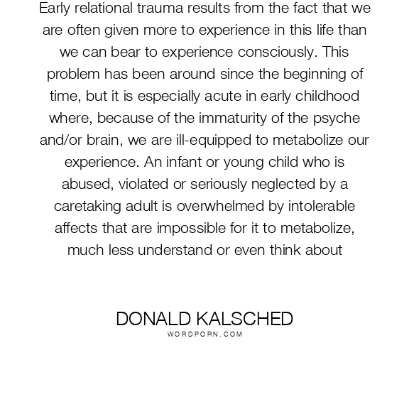 Early relational trauma results from the fact that we are often given more to experience in this life than we can bear to experience consciously. This problem has been around since the beginning of time, but it is especially acute in early childhood where, because of the immaturity of the psyche and/or brain, we are ill-equipped to metabolize our experience. An infant or young child who is abused, violated or seriously neglected by a caretaking adult is overwhelmed by intolerable affects that are impossible for it to metabolize, much less understand or even think about