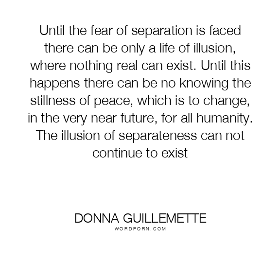Until the fear of separation is faced there can be only a life of illusion, where nothing real can exist. Until this happens there can be no knowing the stillness of peace, which is to change, in the very near future, for all humanity. The illusion of separateness can not continue to exist