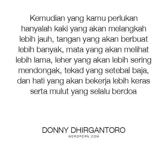 Kemudian yang kamu perlukan hanyalah kaki yang akan melangkah lebih jauh, tangan yang akan berbuat lebih banyak, mata yang akan melihat lebih lama, leher yang akan lebih sering mendongak, tekad yang setebal baja, dan hati yang akan bekerja lebih keras serta mulut yang selalu berdoa