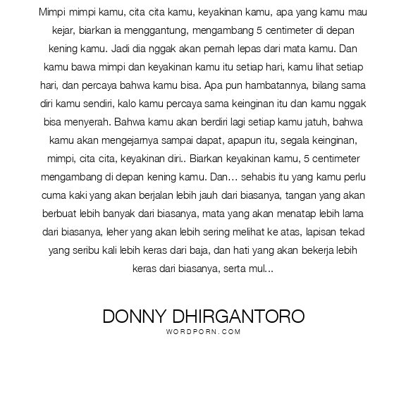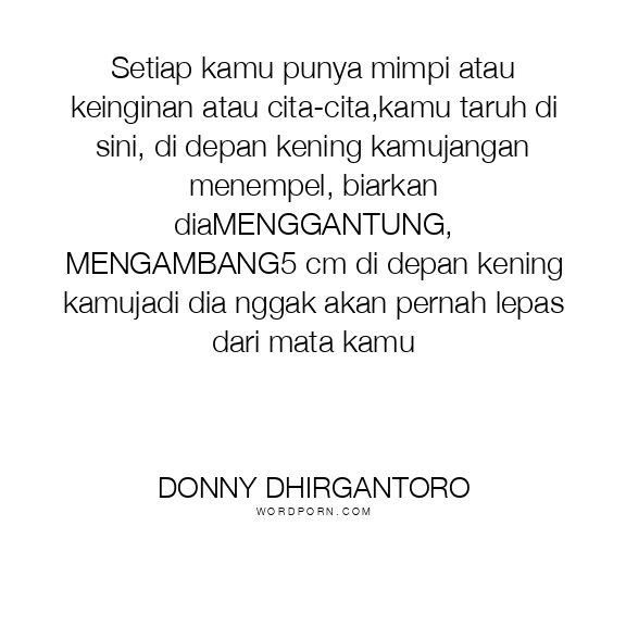 Setiap kamu punya mimpi atau keinginan atau cita-cita,kamu taruh di sini, di depan kening kamujangan menempel, biarkan diaMENGGANTUNG, MENGAMBANG5 cm di depan kening kamujadi dia nggak akan pernah lepas dari mata kamu