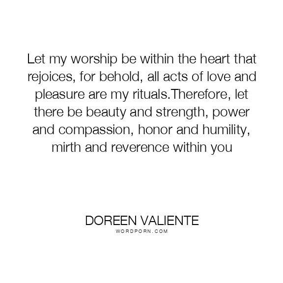 Let my worship be within the heart that rejoices, for behold, all acts of love and pleasure are my rituals.Therefore, let there be beauty and strength, power and compassion, honor and humility, mirth and reverence within you