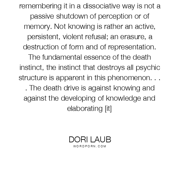 Not knowing trauma or experiencing or remembering it in a dissociative way is not a passive shutdown of perception or of memory. Not knowing is rather an active, persistent, violent refusal; an erasure, a destruction of form and of representation. The fundamental essence of the death instinct, the instinct that destroys all psychic structure is apparent in this phenomenon. . . . The death drive is against knowing and against the developing of knowledge and elaborating [it]