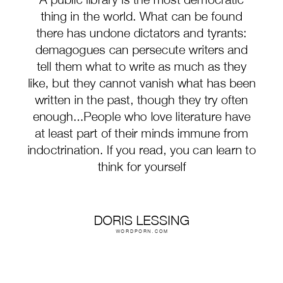 A public library is the most democratic thing in the world. What can be found there has undone dictators and tyrants: demagogues can persecute writers and tell them what to write as much as they like, but they cannot vanish what has been written in the past, though they try often enough...People who love literature have at least part of their minds immune from indoctrination. If you read, you can learn to think for yourself