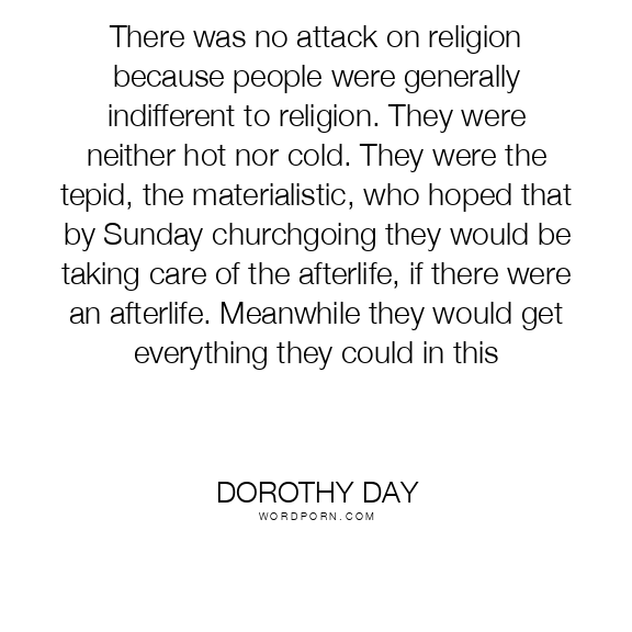There was no attack on religion because people were generally indifferent to religion. They were neither hot nor cold. They were the tepid, the materialistic, who hoped that by Sunday churchgoing they would be taking care of the afterlife, if there were an afterlife. Meanwhile they would get everything they could in this