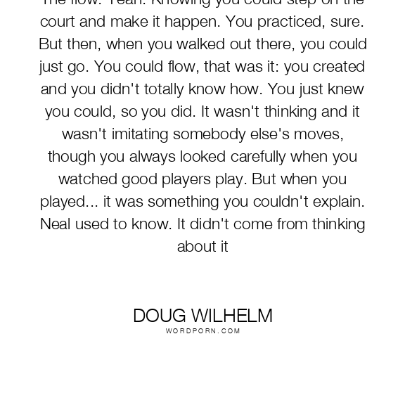 The flow. Yeah. Knowing you could step on the court and make it happen. You practiced, sure. But then, when you walked out there, you could just go. You could flow, that was it: you created and you didn't totally know how. You just knew you could, so you did. It wasn't thinking and it wasn't imitating somebody else's moves, though you always looked carefully when you watched good players play. But when you played... it was something you couldn't explain. Neal used to know. It didn't come from thinking about it