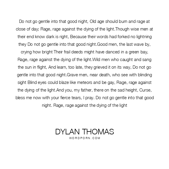 Do not go gentle into that good night, Old age should burn and rage at close of day; Rage, rage against the dying of the light.Though wise men at their end know dark is right, Because their words had forked no lightning they Do not go gentle into that good night.Good men, the last wave by, crying how bright Their frail deeds might have danced in a green bay, Rage, rage against the dying of the light.Wild men who caught and sang the sun in flight, And learn, too late, they grieved it on its way, Do not go gentle into that good night.Grave men, near death, who see with blinding sight Blind eyes could blaze like meteors and be gay, Rage, rage against the dying of the light.And you, my father, there on the sad height, Curse, bless me now with your fierce tears, I pray. Do not go gentle into that good night. Rage, rage against the dying of the light