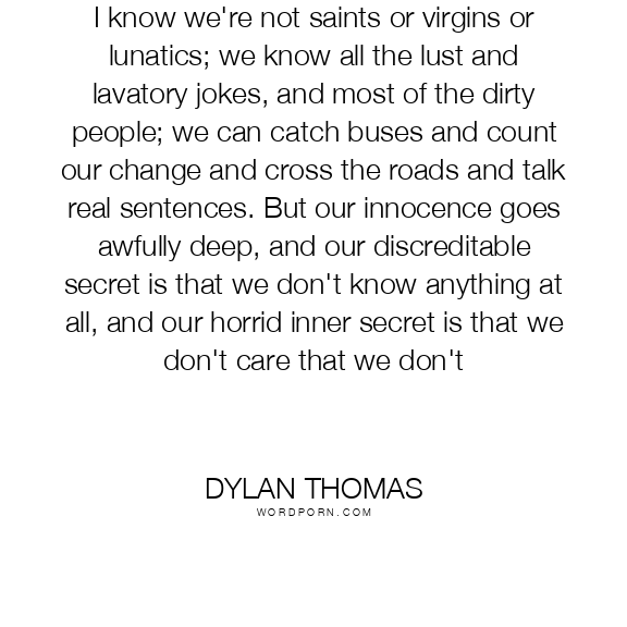 I know we're not saints or virgins or lunatics; we know all the lust and lavatory jokes, and most of the dirty people; we can catch buses and count our change and cross the roads and talk real sentences. But our innocence goes awfully deep, and our discreditable secret is that we don't know anything at all, and our horrid inner secret is that we don't care that we don't