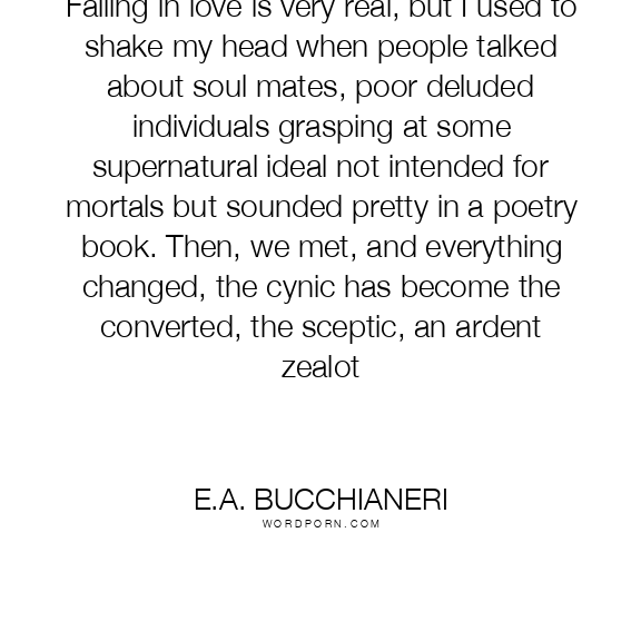 Falling in love is very real, but I used to shake my head when people talked about soul mates, poor deluded individuals grasping at some supernatural ideal not intended for mortals but sounded pretty in a poetry book. Then, we met, and everything changed, the cynic has become the converted, the sceptic, an ardent zealot