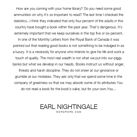 How are you coming with your home library? Do you need some good ammunition on why it's so important to read? The last time I checked the statistics...I think they indicated that only four percent of the adults in this country have bought a book within the past year. That's dangerous. It's extremely important that we keep ourselves in the top five or six percent. In one of the Monthly Letters from the Royal Bank of Canada it was pointed out that reading good books is not something to be indulged in as a luxury. It is a necessity for anyone who intends to give his life and work a touch of quality. The most real wealth is not what we put into our piggy banks but what we develop in our heads. Books instruct us without anger, threats and harsh discipline. They do not sneer at our ignorance or grumble at our mistakes. They ask only that we spend some time in the company of greatness so that we may absorb some of its attributes.You do not read a book for the book's sake, but for your own.You may read because in your high-pressure life, studded with problems and emergencies, you need periods of relief and yet recognize that peace of mind does not mean numbness of mind.You may read because you never had an opportunity to go to college, and books give you a chance to get something you missed. You may read because your job is routine, and books give you a feeling of depth in life.You may read because you did go to college.You may read because you see social, economic and philosophical problems which need solution, and you believe that the best thinking of all past ages may be useful in your age, too.You may read because you are tired of the shallowness of contemporary life, bored by the current conversational commonplaces, and wearied of shop talk and gossip about people.Whatever your dominant personal reason, you will find that reading gives knowledge, creative power, satisfaction and relaxation. It cultivates your mind by calling its faculties into exercise.Books are a source of pleasure - the purest and the most lasting. They enhance your sensation of the interestingness of life. Reading them is not a violent pleasure like the gross enjoyment of an uncultivated mind, but a subtle delight.Reading dispels prejudices which hem our minds within narrow spaces. One of the things that will surprise you as you read good books from all over the world and from all times of man is that human nature is much the same today as it has been ever since writing began to tell us about it.Some people act as if it were demeaning to their manhood to wish to be well-read but you can no more be a healthy person mentally without reading substantial books than you can be a vigorous person physically without eating solid food. Books should be chosen, not for their freedom from evil, but for their possession of good. Dr. Johnson said: "Whilst you stand deliberating which book your son shall read first, another boy has read both