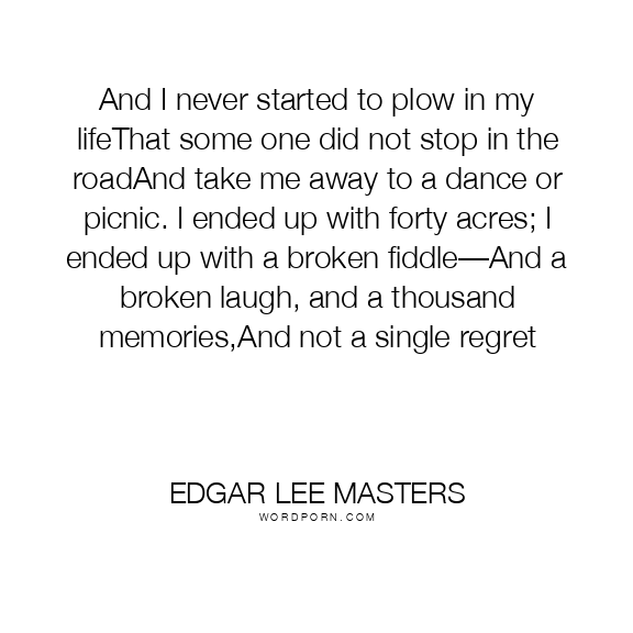 And I never started to plow in my lifeThat some one did not stop in the roadAnd take me away to a dance or picnic. I ended up with forty acres; I ended up with a broken fiddle—And a broken laugh, and a thousand memories,And not a single regret