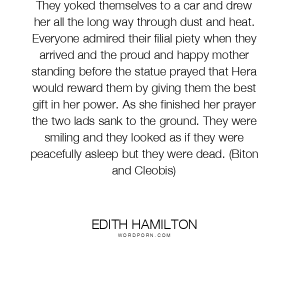 They yoked themselves to a car and drew her all the long way through dust and heat. Everyone admired their filial piety when they arrived and the proud and happy mother standing before the statue prayed that Hera would reward them by giving them the best gift in her power. As she finished her prayer the two lads sank to the ground. They were smiling and they looked as if they were peacefully asleep but they were dead. (Biton and Cleobis)