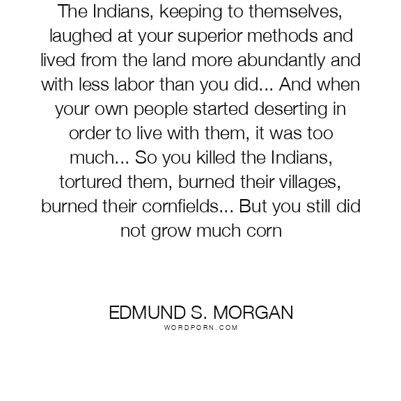 The Indians, keeping to themselves, laughed at your superior methods and lived from the land more abundantly and with less labor than you did... And when your own people started deserting in order to live with them, it was too much... So you killed the Indians, tortured them, burned their villages, burned their cornfields... But you still did not grow much corn