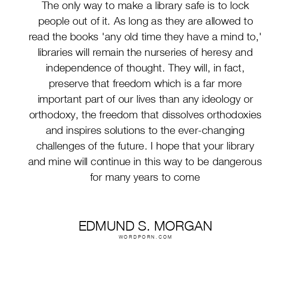 The only way to make a library safe is to lock people out of it. As long as they are allowed to read the books 'any old time they have a mind to,' libraries will remain the nurseries of heresy and independence of thought. They will, in fact, preserve that freedom which is a far more important part of our lives than any ideology or orthodoxy, the freedom that dissolves orthodoxies and inspires solutions to the ever-changing challenges of the future. I hope that your library and mine will continue in this way to be dangerous for many years to come