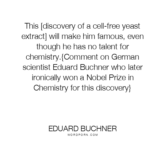 This [discovery of a cell-free yeast extract] will make him famous, even though he has no talent for chemistry.{Comment on German scientist Eduard Buchner who later ironically won a Nobel Prize in Chemistry for this discovery}