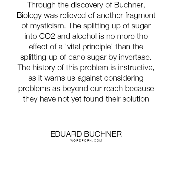Through the discovery of Buchner, Biology was relieved of another fragment of mysticism. The splitting up of sugar into CO2 and alcohol is no more the effect of a 'vital principle' than the splitting up of cane sugar by invertase. The history of this problem is instructive, as it warns us against considering problems as beyond our reach because they have not yet found their solution