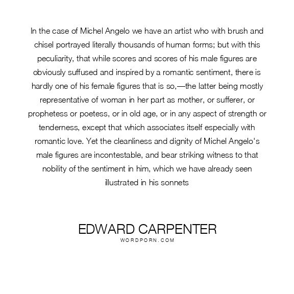 In the case of Michel Angelo we have an artist who with brush and chisel portrayed literally thousands of human forms; but with this peculiarity, that while scores and scores of his male figures are obviously suffused and inspired by a romantic sentiment, there is hardly one of his female figures that is so,—the latter being mostly representative of woman in her part as mother, or sufferer, or prophetess or poetess, or in old age, or in any aspect of strength or tenderness, except that which associates itself especially with romantic love. Yet the cleanliness and dignity of Michel Angelo's male figures are incontestable, and bear striking witness to that nobility of the sentiment in him, which we have already seen illustrated in his sonnets