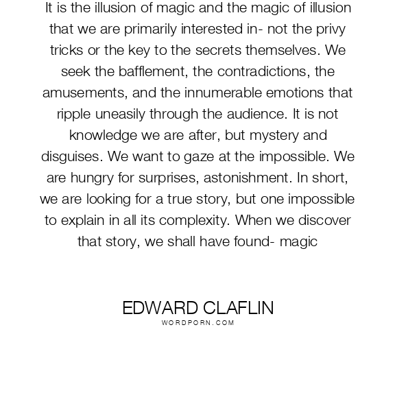 It is the illusion of magic and the magic of illusion that we are primarily interested in- not the privy tricks or the key to the secrets themselves. We seek the bafflement, the contradictions, the amusements, and the innumerable emotions that ripple uneasily through the audience. It is not knowledge we are after, but mystery and disguises. We want to gaze at the impossible. We are hungry for surprises, astonishment. In short, we are looking for a true story, but one impossible to explain in all its complexity. When we discover that story, we shall have found- magic