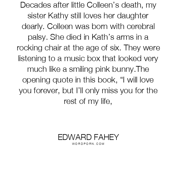 Decades after little Colleen’s death, my sister Kathy still loves her daughter dearly. Colleen was born with cerebral palsy. She died in Kath’s arms in a rocking chair at the age of six. They were listening to a music box that looked very much like a smiling pink bunny.The opening quote in this book, “I will love you forever, but I’ll only miss you for the rest of my life,