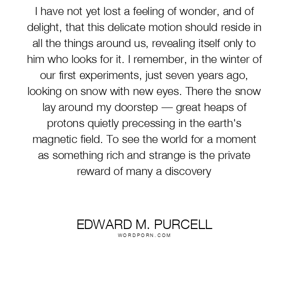 I have not yet lost a feeling of wonder, and of delight, that this delicate motion should reside in all the things around us, revealing itself only to him who looks for it. I remember, in the winter of our first experiments, just seven years ago, looking on snow with new eyes. There the snow lay around my doorstep — great heaps of protons quietly precessing in the earth's magnetic field. To see the world for a moment as something rich and strange is the private reward of many a discovery