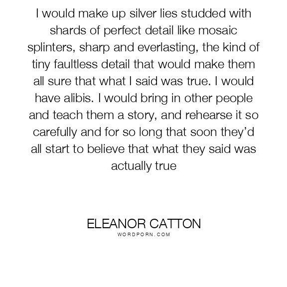 I would make up silver lies studded with shards of perfect detail like mosaic splinters, sharp and everlasting, the kind of tiny faultless detail that would make them all sure that what I said was true. I would have alibis. I would bring in other people and teach them a story, and rehearse it so carefully and for so long that soon they’d all start to believe that what they said was actually true