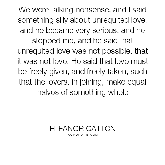 We were talking nonsense, and I said something silly about unrequited love, and he became very serious, and he stopped me, and he said that unrequited love was not possible; that it was not love. He said that love must be freely given, and freely taken, such that the lovers, in joining, make equal halves of something whole