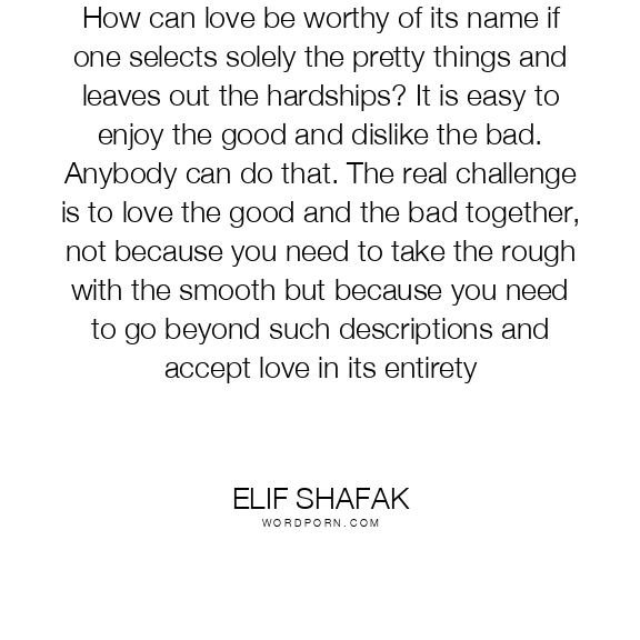 How can love be worthy of its name if one selects solely the pretty things and leaves out the hardships? It is easy to enjoy the good and dislike the bad. Anybody can do that. The real challenge is to love the good and the bad together, not because you need to take the rough with the smooth but because you need to go beyond such descriptions and accept love in its entirety