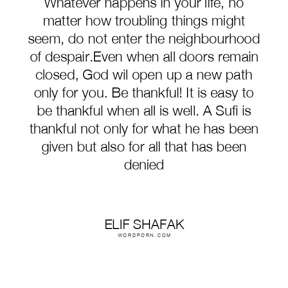 Whatever happens in your life, no matter how troubling things might seem, do not enter the neighbourhood of despair.Even when all doors remain closed, God wil open up a new path only for you. Be thankful! It is easy to be thankful when all is well. A Sufi is thankful not only for what he has been given but also for all that has been denied