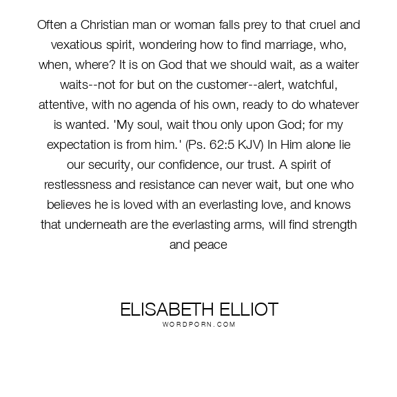 Often a Christian man or woman falls prey to that cruel and vexatious spirit, wondering how to find marriage, who, when, where? It is on God that we should wait, as a waiter waits--not for but on the customer--alert, watchful, attentive, with no agenda of his own, ready to do whatever is wanted. 'My soul, wait thou only upon God; for my expectation is from him.' (Ps. 62:5 KJV) In Him alone lie our security, our confidence, our trust. A spirit of restlessness and resistance can never wait, but one who believes he is loved with an everlasting love, and knows that underneath are the everlasting arms, will find strength and peace