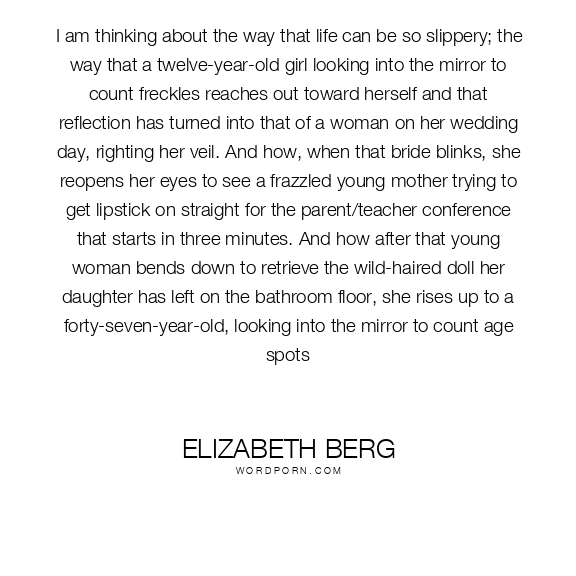 I am thinking about the way that life can be so slippery; the way that a twelve-year-old girl looking into the mirror to count freckles reaches out toward herself and that reflection has turned into that of a woman on her wedding day, righting her veil. And how, when that bride blinks, she reopens her eyes to see a frazzled young mother trying to get lipstick on straight for the parent/teacher conference that starts in three minutes. And how after that young woman bends down to retrieve the wild-haired doll her daughter has left on the bathroom floor, she rises up to a forty-seven-year-old, looking into the mirror to count age spots