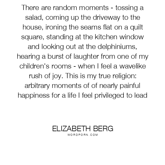 There are random moments - tossing a salad, coming up the driveway to the house, ironing the seams flat on a quilt square, standing at the kitchen window and looking out at the delphiniums, hearing a burst of laughter from one of my children's rooms - when I feel a wavelike rush of joy. This is my true religion: arbitrary moments of of nearly painful happiness for a life I feel privileged to lead
