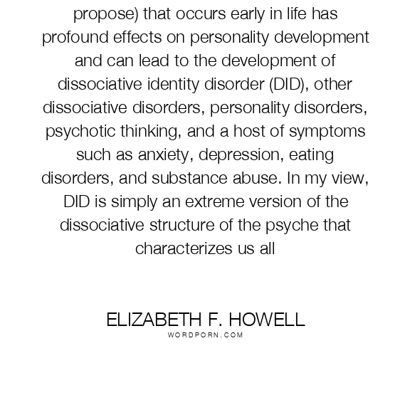 Elizabeth F. Howell quote. Chronic trauma (according to the meaning I propose) that occurs early in life has profound effects on personality development and can lead to the development of dissociative identity disorder (DID), other dissociative disorders, personality disorders, psychotic thinking, and a host of symptoms such as anxiety, depression, eating disorders, and substance abuse. In my view, DID is simply an extreme version of the dissociative structure of the psyche that characterizes us all