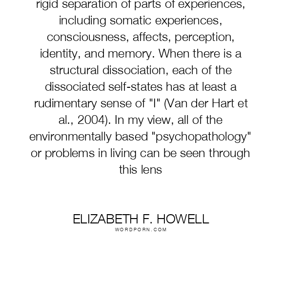 Elizabeth F. Howell quote. Dissociation, in a general sense, refers to a rigid separation of parts of experiences, including somatic experiences, consciousness, affects, perception, identity, and memory. When there is a structural dissociation, each of the dissociated self-states has at least a rudimentary sense of
