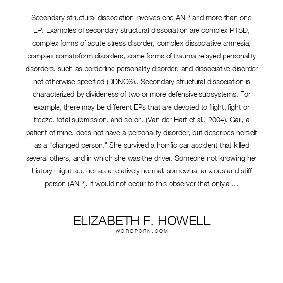 Elizabeth F. Howell quote. Secondary structural dissociation involves one ANP and more than one EP. Examples of secondary structural dissociation are complex PTSD, complex forms of acute stress disorder, complex dissociative amnesia, complex somatoform disorders, some forms of trauma-relayed personality disorders, such as borderline personality disorder, and dissociative disorder not otherwise specified (DDNOS).. Secondary structural dissociation is characterized by divideness of two or more defensive subsystems. For example, there may be different EPs that are devoted to flight, fight or freeze, total submission, and so on. (Van der Hart et al., 2004). Gail, a patient of mine, does not have a personality disorder, but describes herself as a